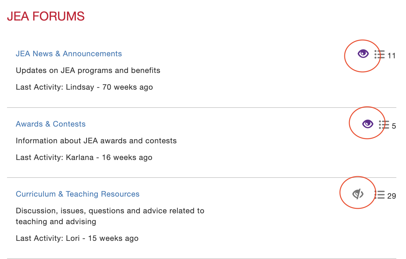 - For example, to watch “Curriculum & Teaching Resources,” click on JEA Forum, then click the eyeball at the right of Curriculum & Teaching Resources. You can watch any or all of the topics listed there.