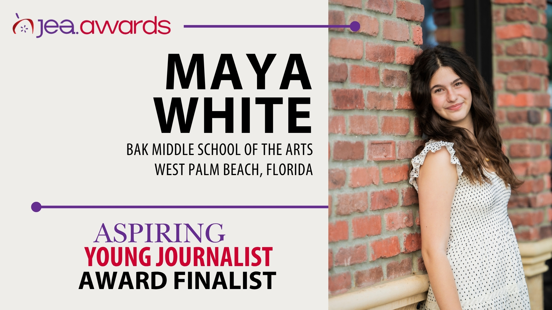 Judges also recognized Maya White of Bak Middle School of the Arts in Boynton Beach, Florida, as the Aspiring Young Journalist runner-up, as both students exhibited the criteria for the award given to outstanding middle school/junior high journalists: